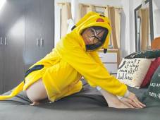 The next scene is a knock on the door. The target is dressed in shorts and a black mask on. He opens the door and it's you. Your dressed in blue pantyhose, tennis shoes with your blue leotard, wearing a mask, blue gloves and carrying a bag. You walk forward, place your hand on the man's chest and ask the man if he's ready for the best sessions of his life. The man asks who you are. You tell him your new but not to worry, he will have a lot of fun.